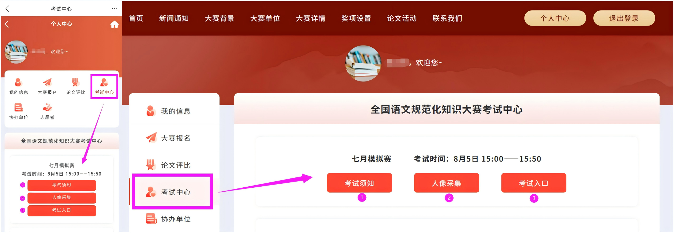 3.人像采集:个人中心→考试中心→点击进行人像采集。