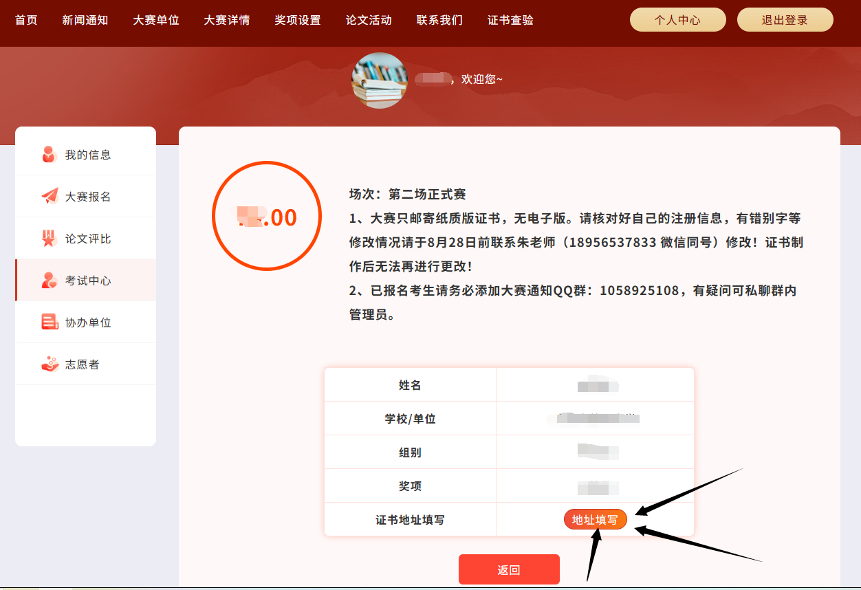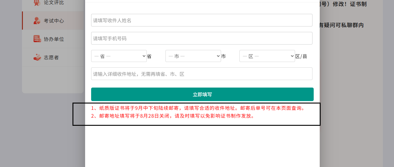 ②大赛只邮寄纸质版证书,没有电子版!邮寄地址填写将于8月28日关闭,请及时填写以免影响证书制作发放。
