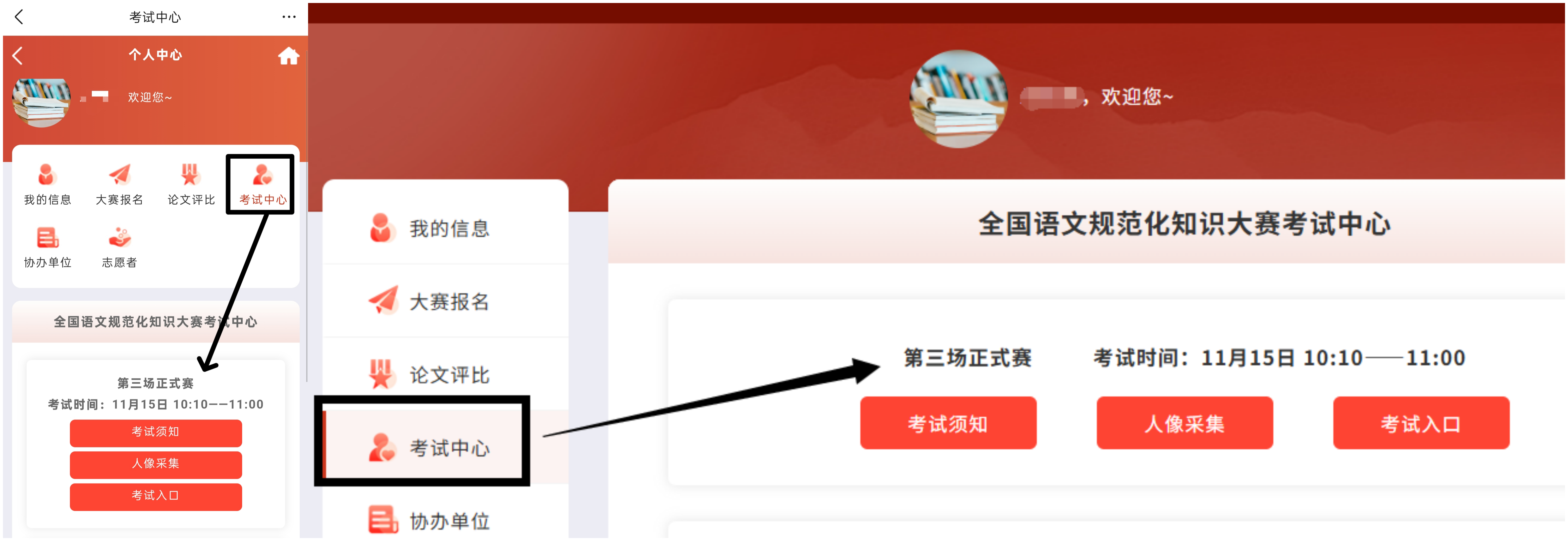 3.人像采集:个人中心→考试中心→点击进行人像采集。